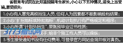 每逢高招录取之际,招生陷阱和骗局也屡见不鲜。省教育考试院提醒广大考生和家长,一定要坚信,在普通高校招生录取过程中,没有人可用钱买分数,没有人可在高招中享有特权;除省级招生部门外,任何机构不得进行普通高校招生。不要轻信那些招生中介(机构或个人)所谓拿钱能到高校争取特批指标之类的承诺。