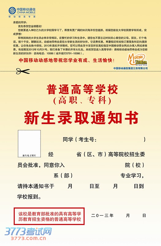 [图文]2013江西高考高职专科新生录取通知书(外省)