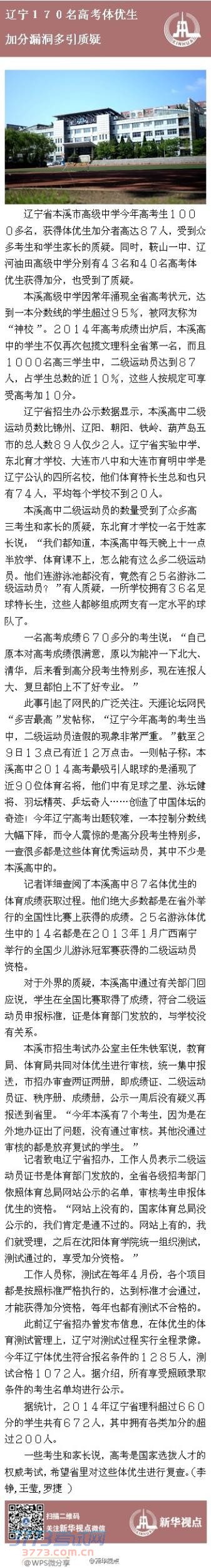 【辽宁170名高考体优生加分漏洞多引质疑】辽宁省本溪市高级中学今年高考生1000多名,获得体优生加分者高达87人,受到众多考生和学生家长的质疑。同时,鞍山一中、辽河油田高级中学分别有43名和40名高考体优生获得加分,也受到了质疑。