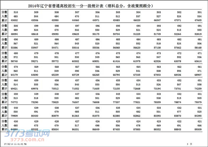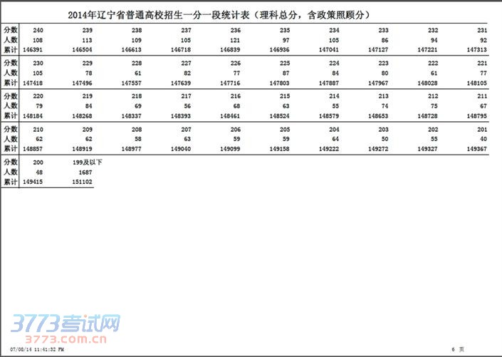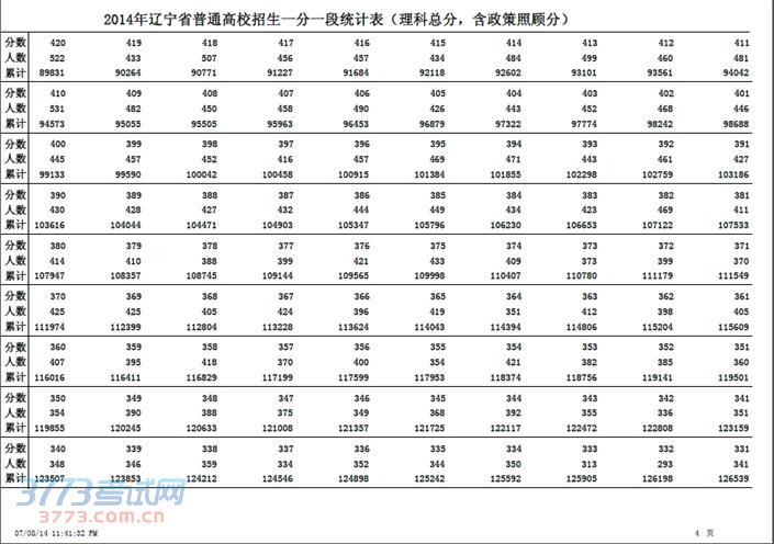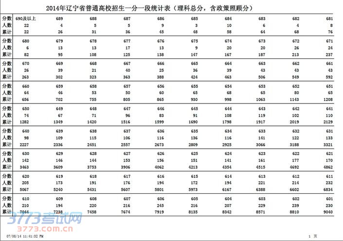 [组图]2014辽宁高考一分一段统计表(理科总分含加分)