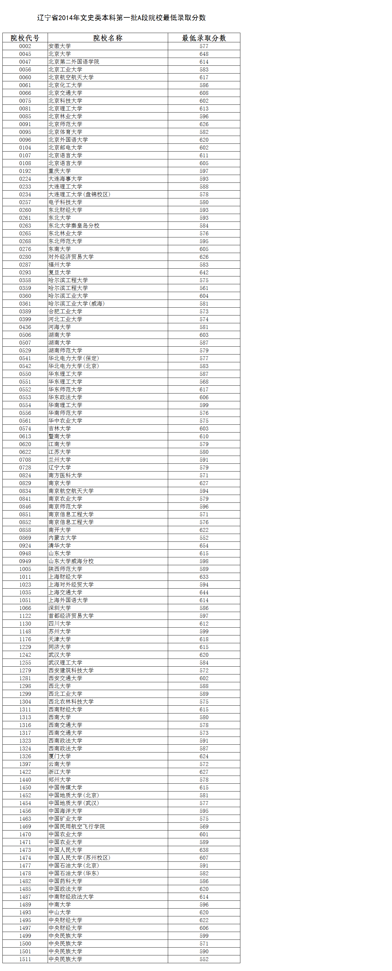 [图文]2014辽宁高考一本A文科院校最低录取分数线