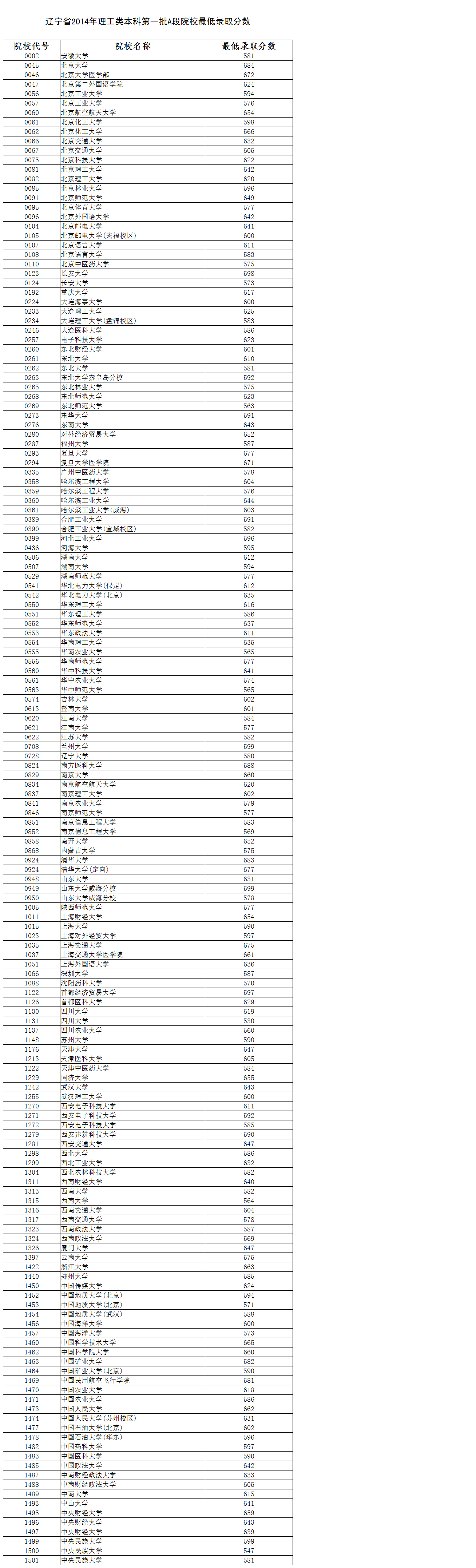[图文]2014辽宁高考一本A理科院校最低录取分数线