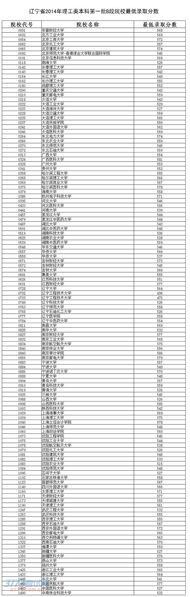 [组图]2014辽宁高考理科一本B段院校最低录取分数线