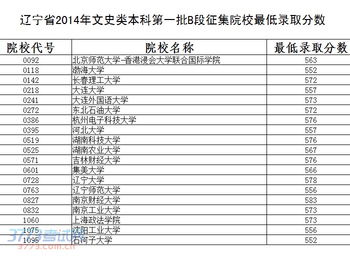 辽宁省2014年文史类本科第一批B段征集院校最低录取分数(点击放大查看)