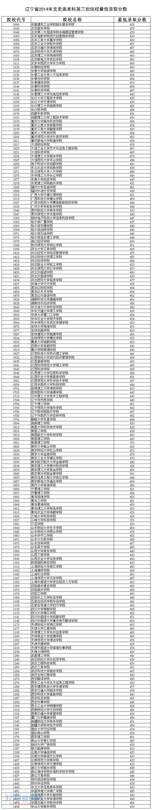 辽宁省2014年文史类本科第三批院校最低录取分数(点击放大查看)