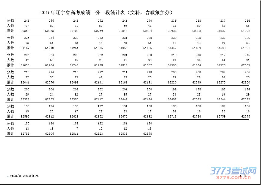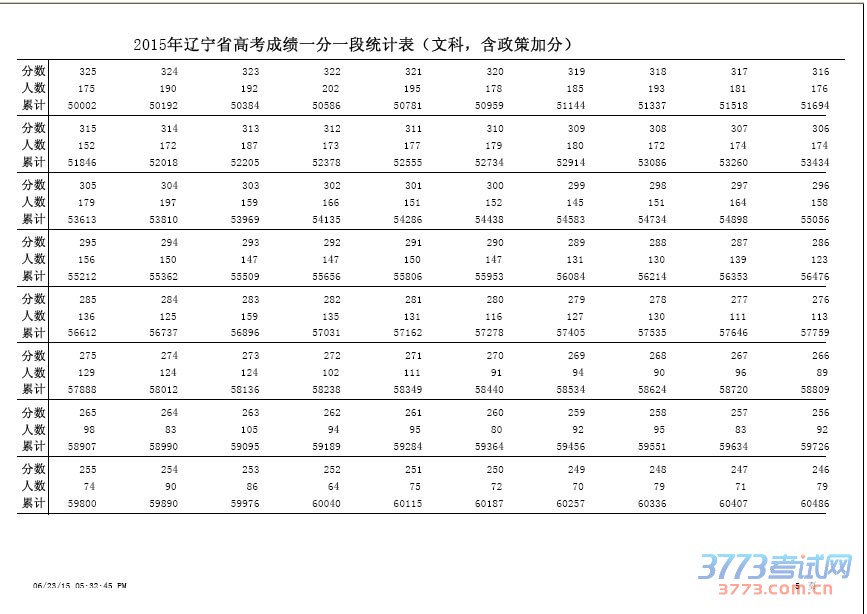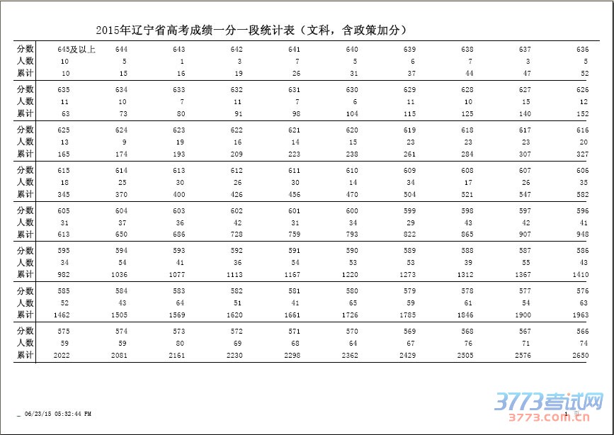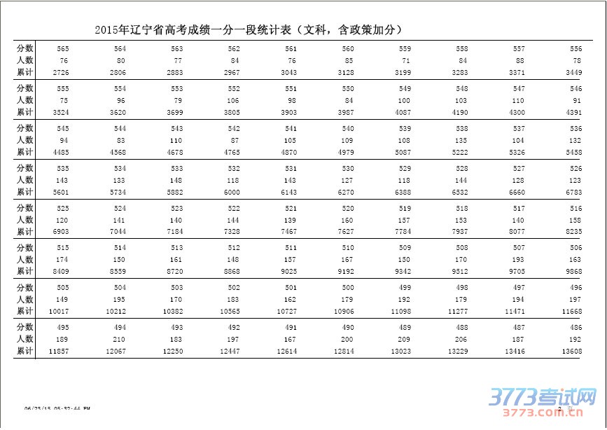 [组图]2015辽宁高考成绩一分一段表(文科含加分)