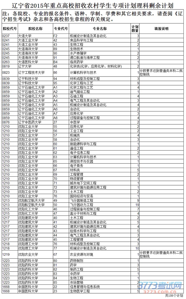 2015辽宁高考农村学生专项计划理科补录剩余计划