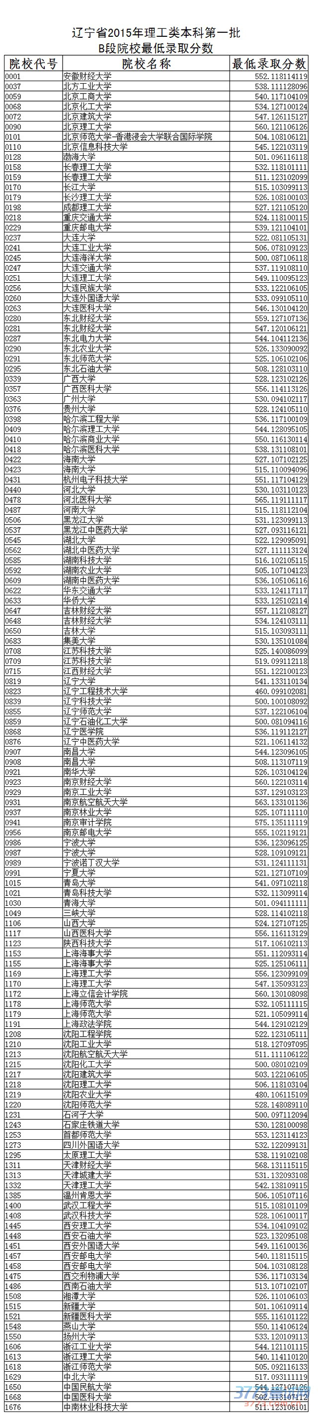 2015辽宁高考一B理科院校录取分数线