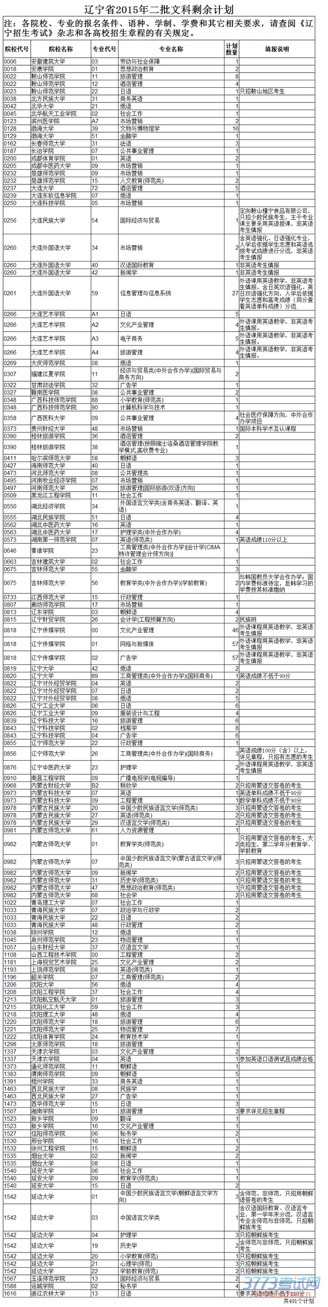 2015年辽宁省普通高校招生录取本科第二批文科剩余计划(点击放大查看)