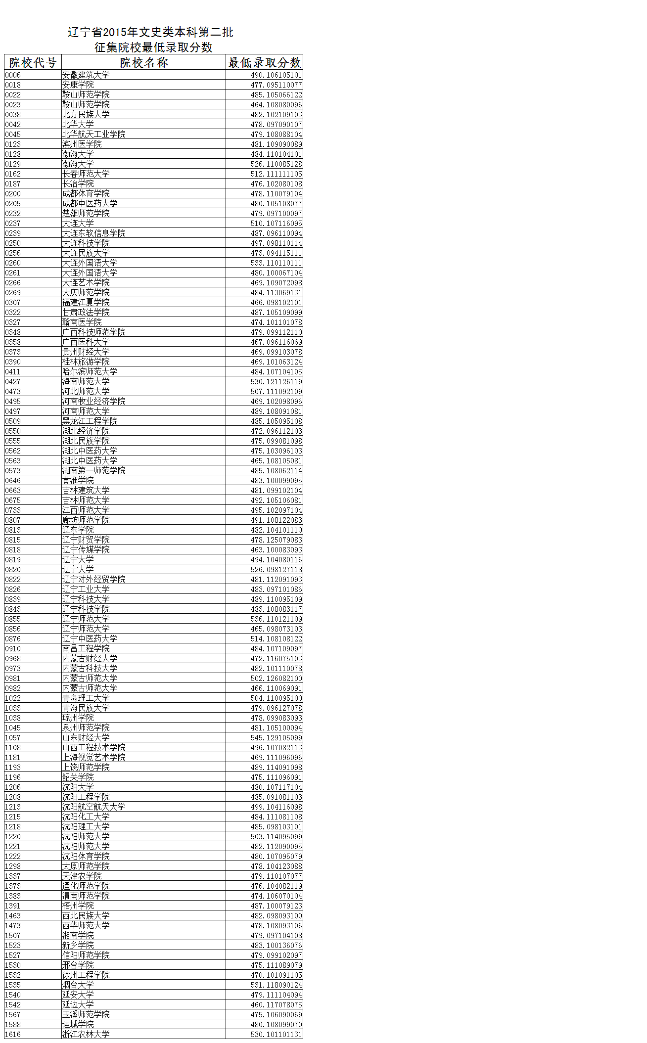 [图文]辽宁省2015年文史类本科第二批征集院校录取最低分数
