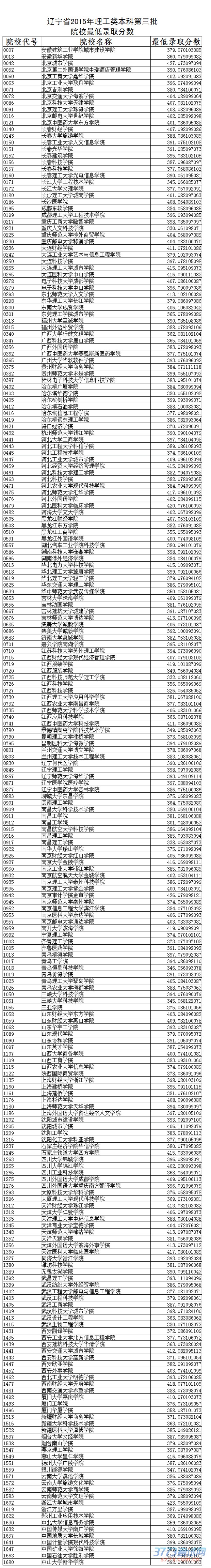 辽宁省2015年理工类本科第三批院校录取最低分数(点击放大查看)