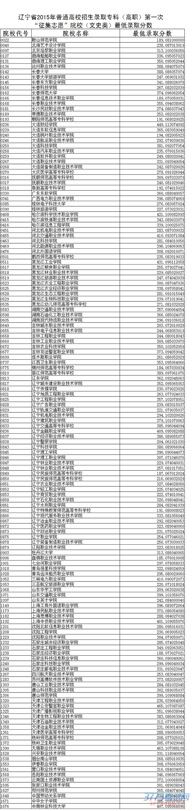 辽宁省2015年普通高校招生录取专科(高职)第一次“征集志愿”院校(文史类)最低录取分数(点击放大查看)