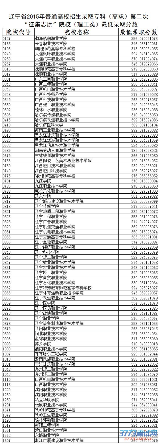 辽宁省2015年普通高校招生录取专科(高职)第二次征集志愿院校(理工类)最低录取分数