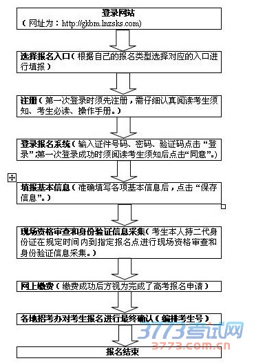 (一)报名基本流程为:考生网上填报基本信息→现场资格审查和身份验证信息采集→网上缴费→各地招考办对考生报名进行最终确认(编排考生号)。