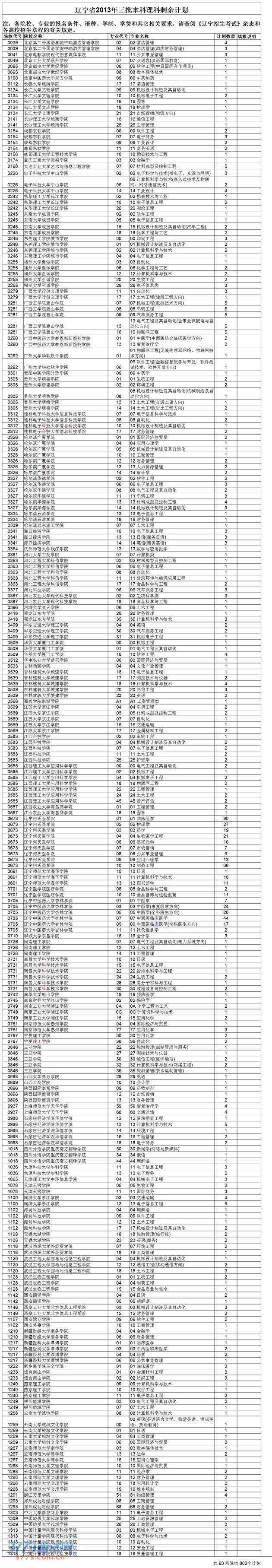 [图文]2013辽宁高考三本理科补录剩余招生计划