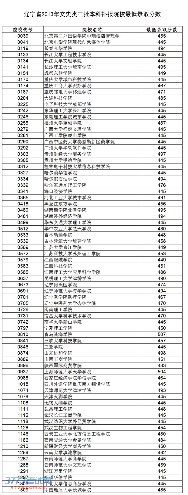 辽宁省2013年文史类三批本科补报院校最低录取分数辽宁省2013年文史类三批本科补报院校最低录取分数