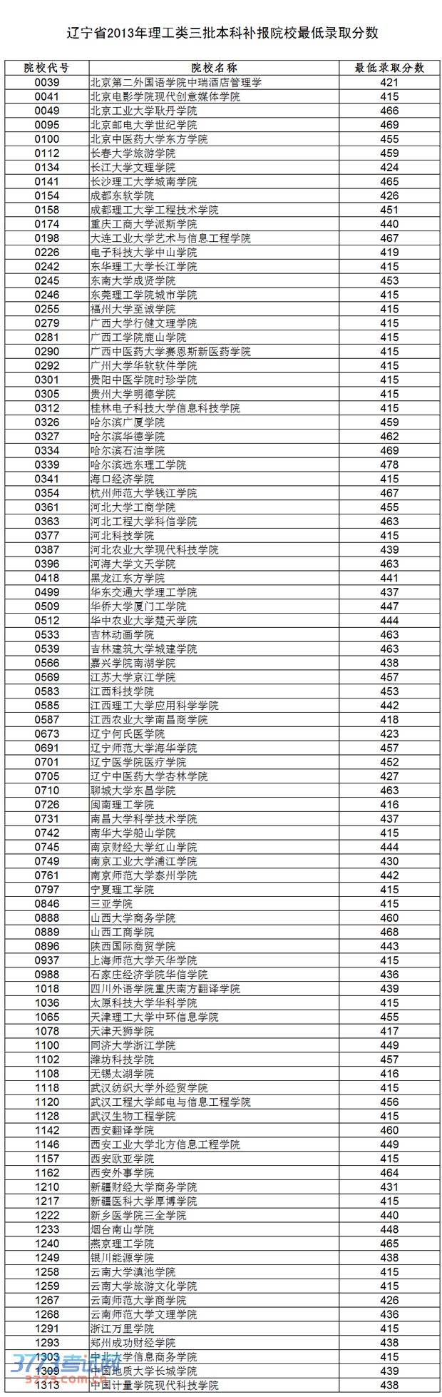 [图文]2013辽宁高考三本补报院校录取分数线(理科)