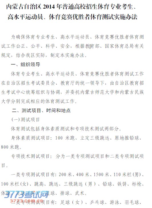 内蒙古自治区2014年普通高校招生体育专业、高水平运动员、体育竞赛优胜者专业测试实施办法