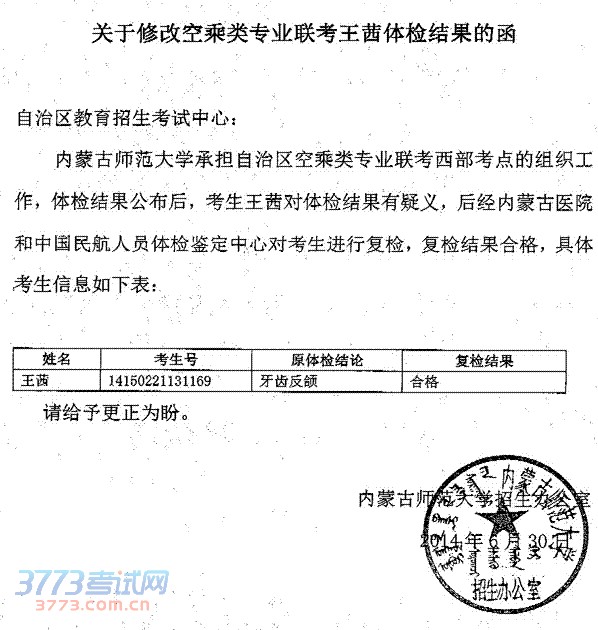 [图文]2014内蒙古修改空乘类专业联考王茜体检结果的函