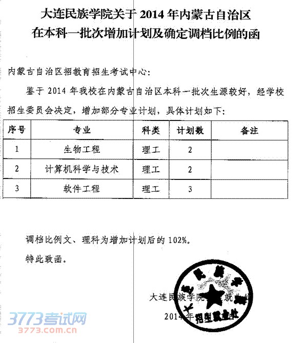 [图文]2014内蒙古高考大连民族大学增加计划的通知
