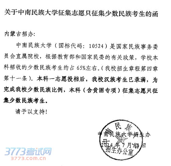 关于中南民族大学只征集少数民族考生的通知