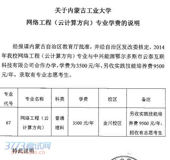 关于内蒙古工业大学网络工程(云计算方向)专业学费的说明