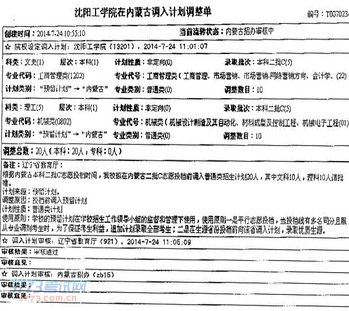[图文]2014内蒙古二本C沈阳工学院增加计划的通知