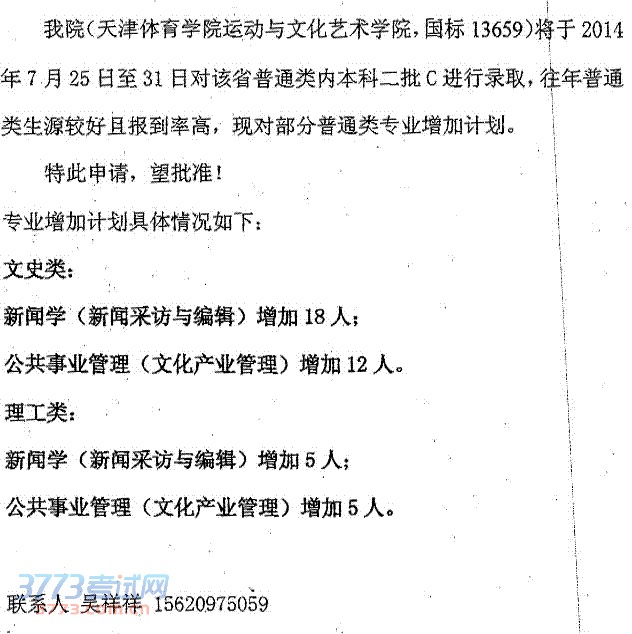 关于本科二批C天津体育学院运动与文化艺术学院增加计划的通知