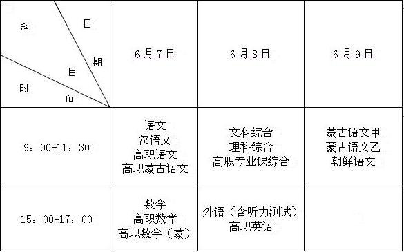 2007年内蒙古自治区普通高等学校招生统一考试(含高等职业院校对口招收中等职业学校毕业生考试)各科目考试时间表