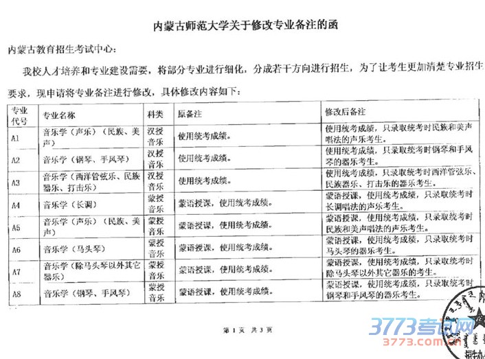 [组图]内蒙古师范大学关2015内蒙古艺术类修改专业备注的函