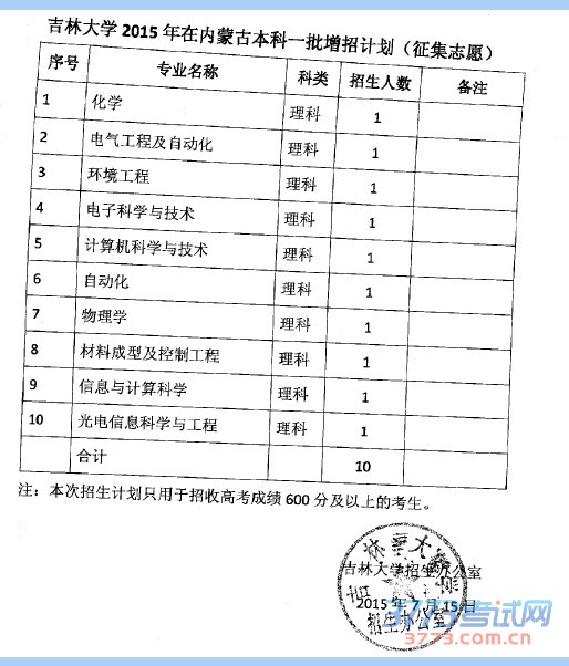 [图文]吉林大学2015内蒙古一本增招计划通知