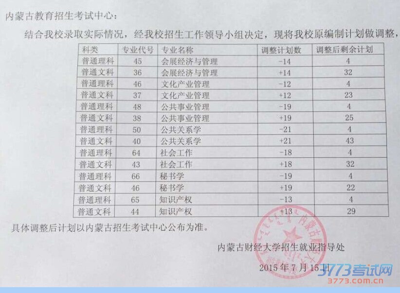 [图文]内蒙古财经大学2015内蒙古高考调整计划的通知