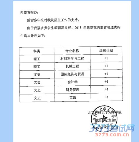 北京科技大学天津学院增加计划的说明