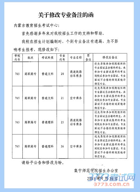 [图文]集宁师范学院内蒙古高考修改专业备注的函
