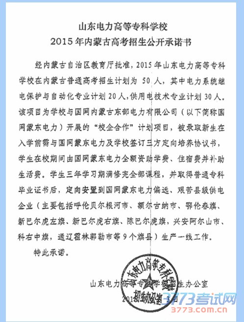 山东电力高等专科学校2015年内蒙古高考招生公开承诺书