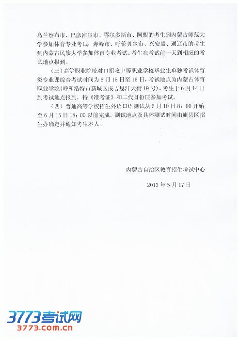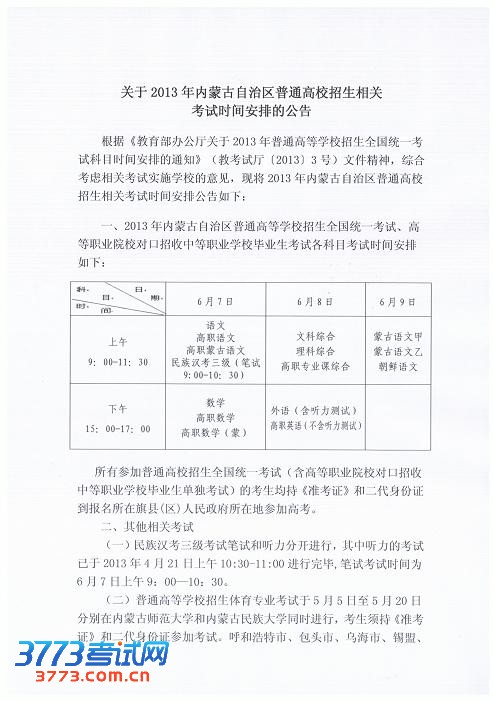 [组图]2013年内蒙古高考考试时间安排公告