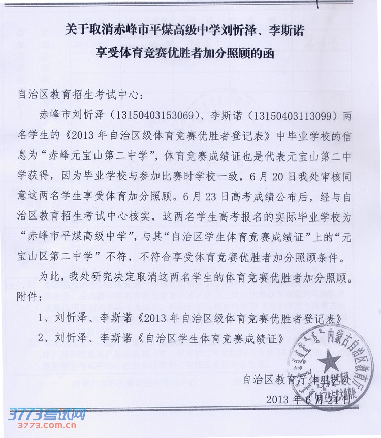 关于取消赤峰市平煤高级中学刘忻泽、李斯诺享受体育竞赛优胜者加分照顾的函