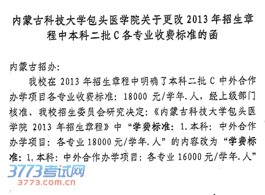内蒙古科技大学包头医学院关于更改2013年招生章程中本科二批C各专业收费标准的函