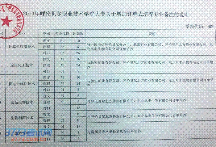 [图文]2013年呼伦贝尔职业技术学院大专增加订单式专业备注说明