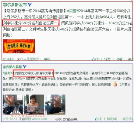6月23日零时,随着2014年内蒙古高考成绩开通查询,文理科状元双双出炉。据内蒙古晨报官方微博(@内蒙古晨报)和鄂尔多斯市官方微博(@鄂尔多斯发布)的消息,文理科状元分别出自呼市二中和鄂尔多斯市一中。