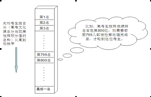第一步,先对考生按总分(高考文化课总分与政策性照顾分值的总和)从高到低排序,分数高的考生先检索投档。比如某理科考生成绩排在全区全体理科考生的第800名,需要前面799人检索处理完成后,才轮到这位考生(如下图 )。
