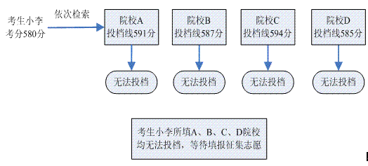 如果考生小李填报的4(6)所院校的投档线均超过580分,则他的4(6)个“平行志愿”均无法投档,只能等待参加“征集志愿”的填报(见下图)。