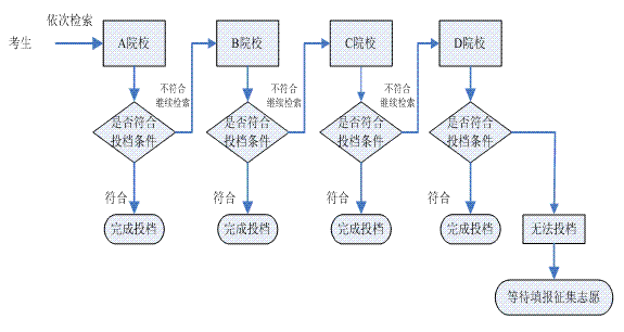第二步,投档时按照排序逐个对考生的“平行志愿”从A院校到D(F)院校的顺序进行检索,一旦出现符合投档条件的院校,即向该院校投档(见下图)。