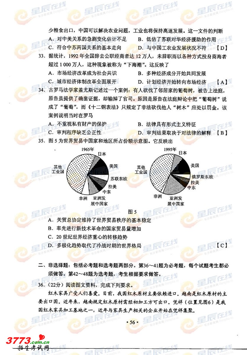 2012年宁夏高考文综试题答案发布
