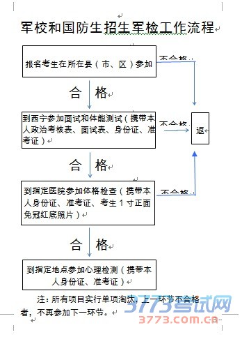 (五)招录工作程序:按照县(市、区)人武部组织政治考核、考生本人填报志愿、省军区集中组织军检、省招生办投档、院校录取的程序进行。
