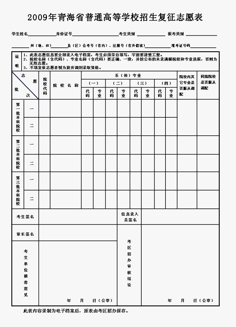 [图文]2009年青海省普通高等学校招生复征志愿表样表