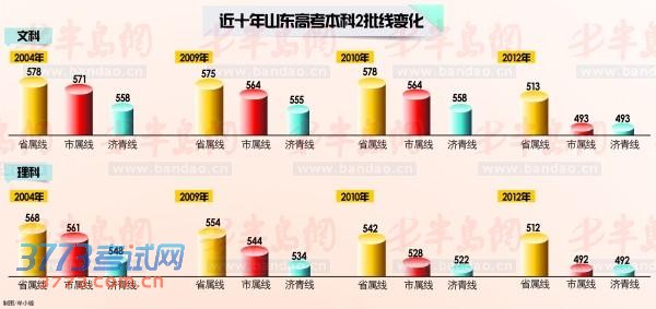 青岛考生享受单独划线的批次越来越少 ,济青线的优势近两年来也在减少。在 2010年以前,济青线一般保持着比省属线低20分、比市属线低10分左右的优势,但到了 2011年,济青线本科二批文理线虽然仍比省属线低20分,但和市属线之间的差距已微乎其微,文科线492分,和市属线相同,理科线483分,也只比市属线低2分;到了 2012年,济青二本线已经和市属线完全相同,文科493分、理科492分,全省二本线实际已变成两条,济南、青岛已不再专享单独划线特权。