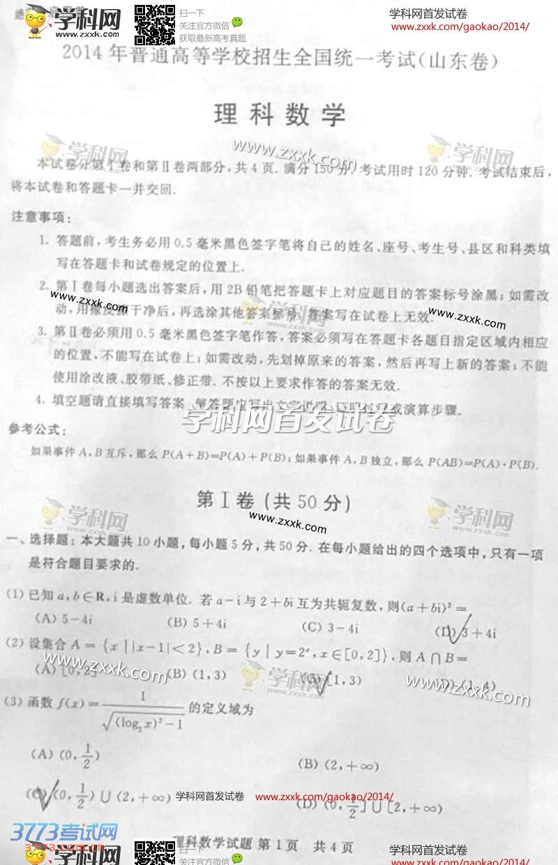 [图文]2014山东高考数学理科试题卷发布(含部分答案)