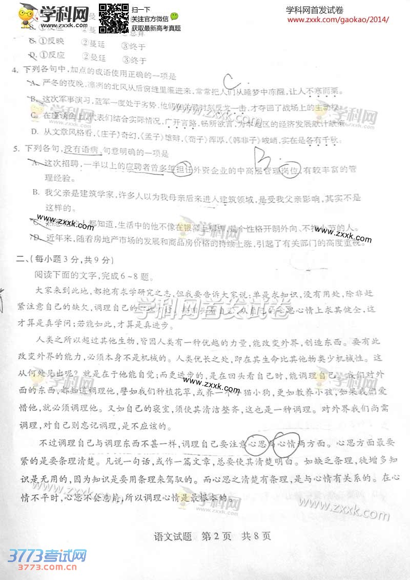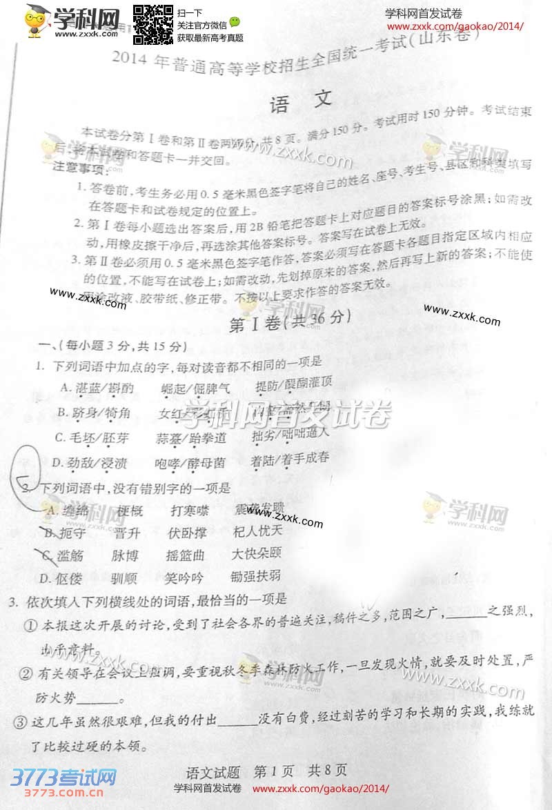 [组图]2014山东高考语文试题及部分答案