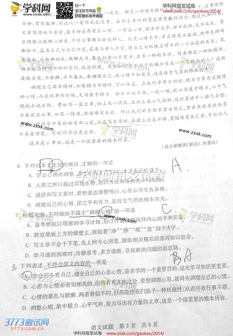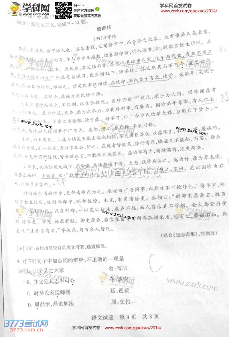 [组图]2014山东高考语文试题及部分答案
